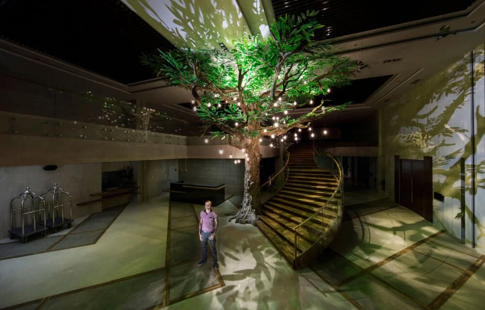 In 2018, James Doran-Webb and the ReCreativity team were invited to reimagine the lobby of Cebu’s Maayo Hotel. Rising seven meters high, a sculpted tree took form from long-dead wood, reclaimed stainless steel, and recycled blown glass - a living monument to nature reborn. Alongside it, a waterfall of natural stone reinforced with recycled steel, and a flock of origami birds crafted from recycled sheet metal, brought movement and spirit into the space. Together, these three sculptural elements softened the industrial lines of the interior, transforming the seventh-floor lobby into a sanctuary where nature and design meet.